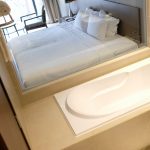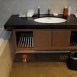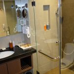 Tiếp theo, wc là khu vực mình quan tâm thứ 2 mỗi khi ở khách sạn/ resort nào đó. Mình ấn tượng với wc được thiết kế theo không gian mở, được ngăn với giường ngủ bằng chỉ với 1 vách kính trong suốt, làm gì bên trong, ai cũng tha hồ thấy :-D. Đùa chút thôi, có rèm sáo che song song với tấm kính cho những “công tác” riêng tư nha mấy chế.